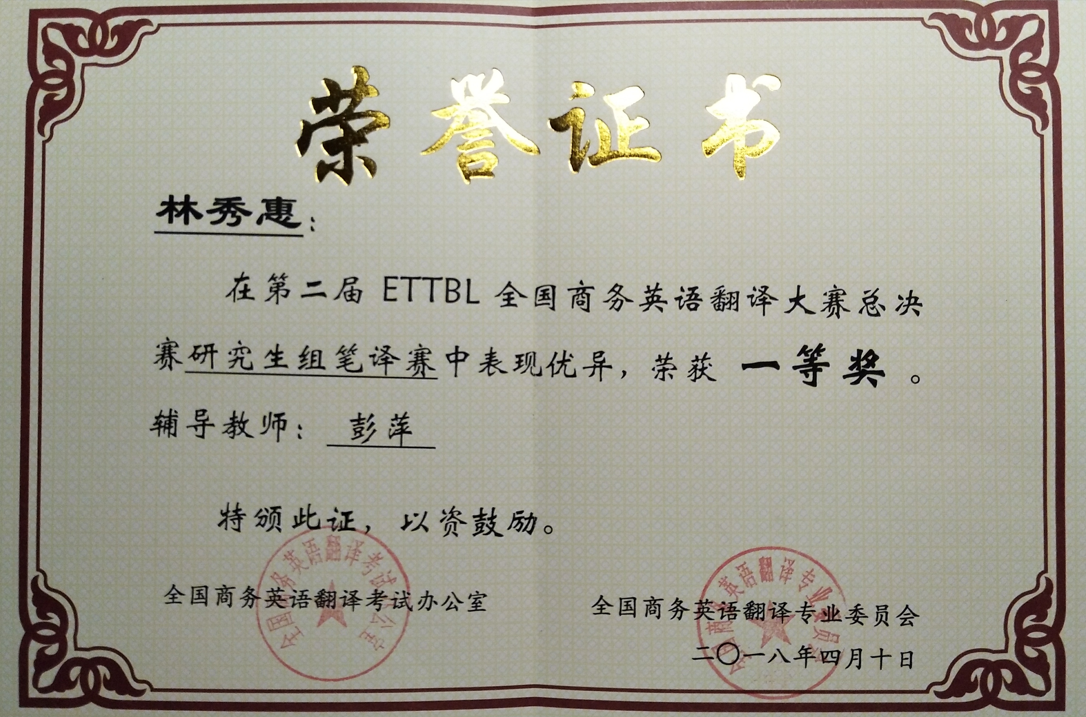 2018年4月15日,由全国商务英语翻译考试办公室、全国商务英语翻译专业委员会主办,北京外国语大学协办,必赢官网承办的第二届ETTBL全国商务英语翻译大赛总决赛在北外国际大厦成功举行。