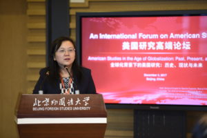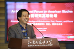 论坛发言阶段,11位来自中美两国的美国研究领域的优秀学者,围绕“全球化背景下的美国研究”主题进行了主旨发言。专家学者就中美两国学者在美国研究领域的研究定位、研究内容、研究方法和研究成果进行了深入剖析和反思,论坛上的主旨发言和交流对话广泛涉及中美政治外交关系、美国社会文化与文学艺术、美国少数族裔、美国史学研究等多个主题。