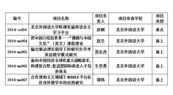 根据《北京市教育委员会关于批准2014年度北京高等学校教育教学改革立项项目的通知》,市教委2014年度批准19个项目为北京高等学校教育教学改革立项重点项目(含联合项目),267个项目为立项面上项目(含联合项目)。