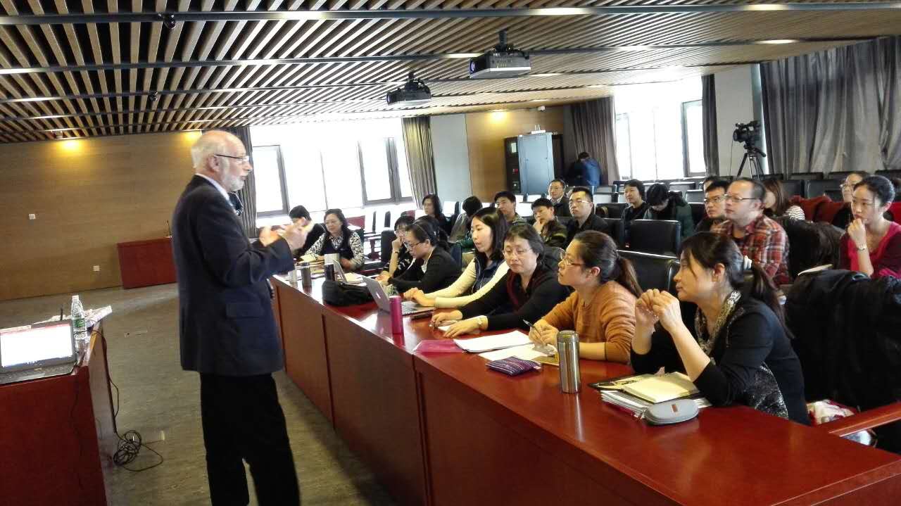 在第一天的工作坊中, Byram 教授介绍了工作坊的定义,明确这次系列工作坊的目的是和大家一起研究探讨在教学过程中如何将理论与实践相结合。随后,他指出在英语教学中语言和文化是紧密联系在一起的,教师对跨文化的语言教学应该有高度的敏感性和好奇心。在谈到知识、能力和测评内容时,Byram教授认为知识应分为两种: 即知识 (knowing about that; knowledge)和技能(knowing how; skill),而知识和技能结合起来就是能力(competence),所以教师在教学中既要重视对学生知识的传授又要强调对他们技能的培养。 Byram教授还以“测评”为小组讨论内容,请在场教师结合自身教学实践展开小组讨论并随后回答了老师们提出的问题。Byram 教授认为在教学中只教授语言内容是不够的,还应该强调文化在其中的重要性,要重视学生文化与能力的培养,并以Kate Fox 所写的《看看英国人!》(Watching the English, 2004)一书为例从行为、信念、价值等方面阐述了文化对非母语学习者的重要性。